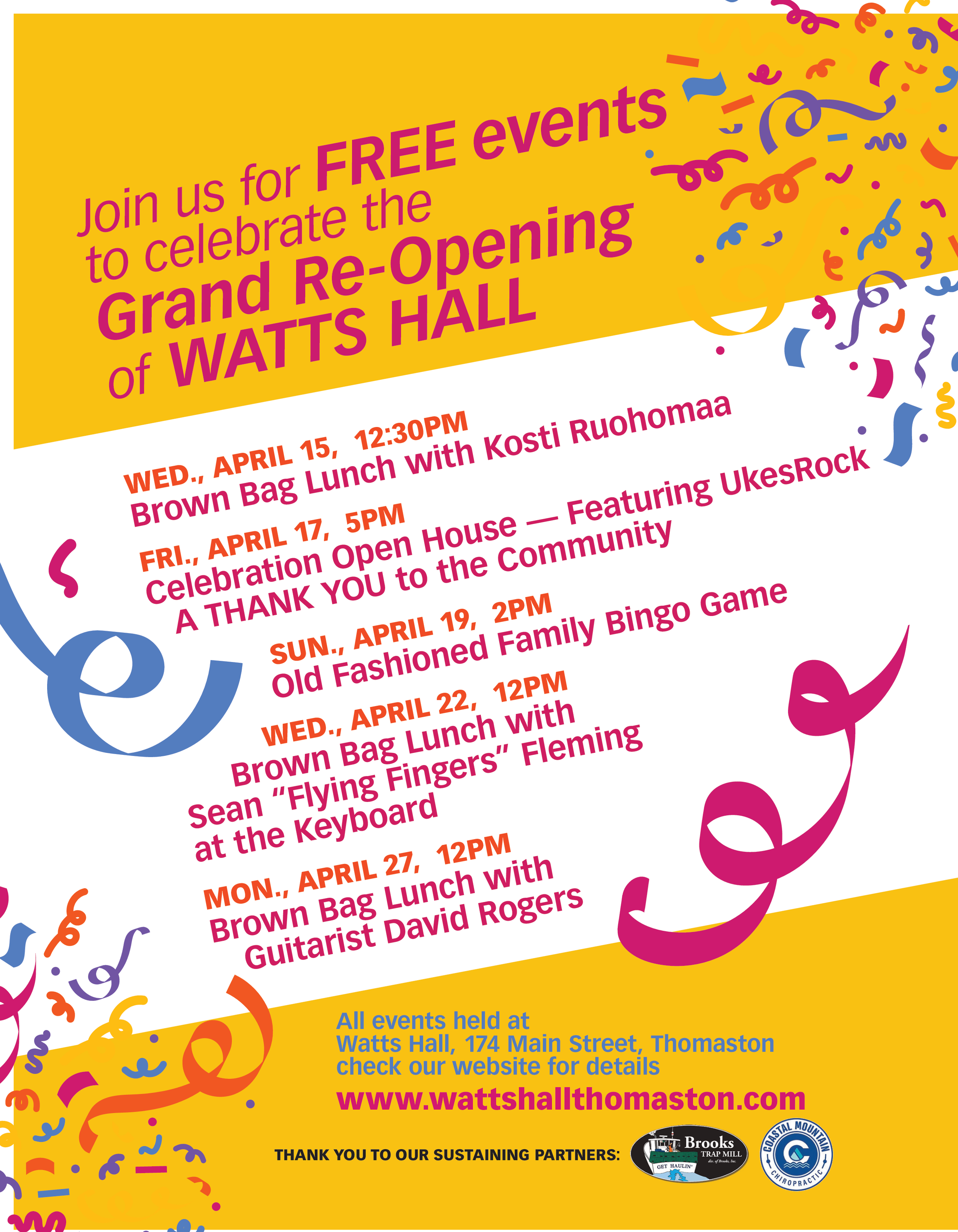 Join us for a FREE open house event to welcome the community back to Watts Hall! UkesRock will be providing music for the evening. You’ll have the opportunity to see the changes and upgrades we’ve made to the Hall, enjoy light refreshments, and bid on items in our silent auction.